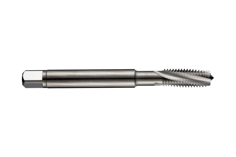 Метчик со спиральной канавкой и фаской формы C, с шагом 2-3xP, для метрической резьбы ISO M6 с шагом 1,00 мм и классом точности 6H, размеры по стандарту DIN 371, с хвостовиком 6,0 мм и квадратным приводом 4,9 мм, цельный твердосплавный с блестящей поверхностью и углом наклона винтовой линии 15° для нарезания резьбы в глухих отверстиях 2xD в ковком, высокопрочном, аустенитном или отпущенном чугуне с шаровидным графитом и вермикулярным графитом, а также литом из алюминия.