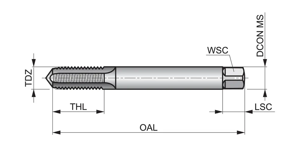 Метчик с прямой канавкой и фаской формы C, с шагом 2-3xP, для метрической резьбы ISO M4 с шагом 0,70 мм и классом точности 6HX, размеры по стандарту DIN 371, с хвостовиком 4,5 мм и квадратным приводом 3,4 мм, цельный твердосплавный с покрытием TiCN для нарезания сквозной или глухой резьбы 2xD в закаленной стали >55HRC