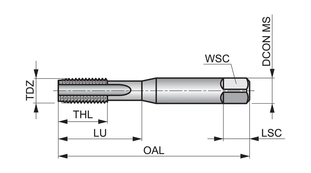 Метчик ручной с прямой канавкой №3 с шлицем 2-3xP, для резьбы Британской ассоциации BA 2 с шагом 0,81 мм и нормальным классом точности, размеры по стандарту ISO 529 с хвостовиком 5,0 мм и квадратным приводом 4,0 мм, из быстрорежущей стали с блестящей отделкой для нарезания резьбы 1,5xD в сквозных или глухих отверстиях в станках с ЧПУ и в углеродистой стали без покрытия.