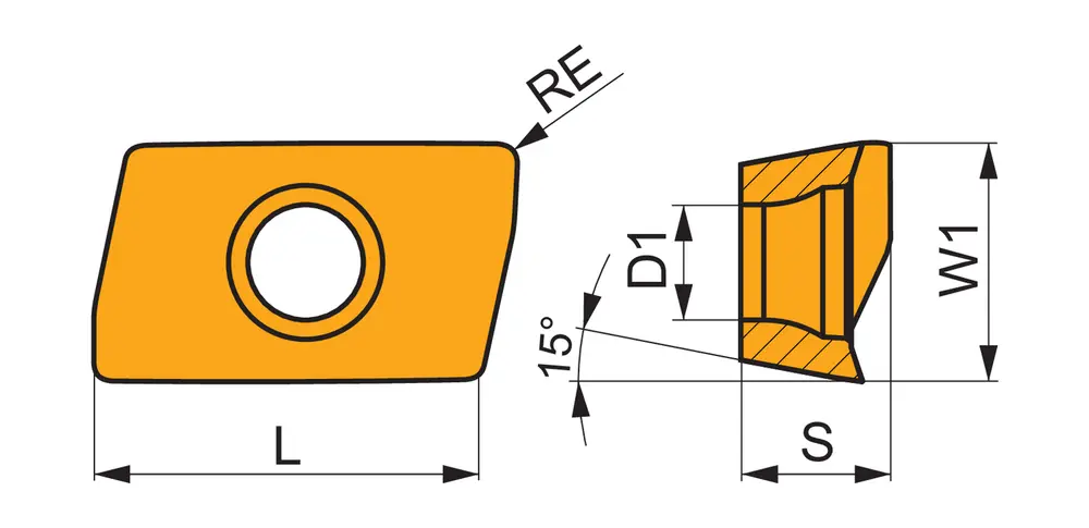 Односторонняя фрезерная пластина ADEX 1606, параллелограмм 85° для максимальной глубины резания 13,0 мм, с радиусом угла 0,8 мм, точностью индексации в соответствии с классом допуска E по ISO и геометрией FM со скругленными режущими кромками и фаской, мелкозернистый карбид WC-Co с покрытием PVD M8330 в диапазонах ISO P20 -P40 и K20 -K40 для обработки стали и чугуна фрезами с уступами SAD16E или фрезами с уступами с удлиненной канавкой J(T)-SAD16E