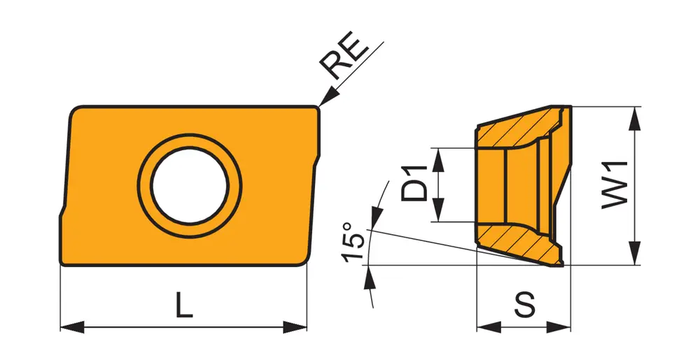 Односторонняя фрезерная пластина ADKT 1505 со стружколомами, параллелограмм 85° для максимальной глубины резания 13,0 мм, с радиусом угла 0,8 мм, точностью индексации в соответствии с классом допуска ISO-K и геометрией M со скругленными режущими кромками, мелкозернистый карбид WC-Co с покрытием PVD M8340 в диапазонах ISO P25 -P50 и M20 -M40 для обработки стали и нержавеющей стали