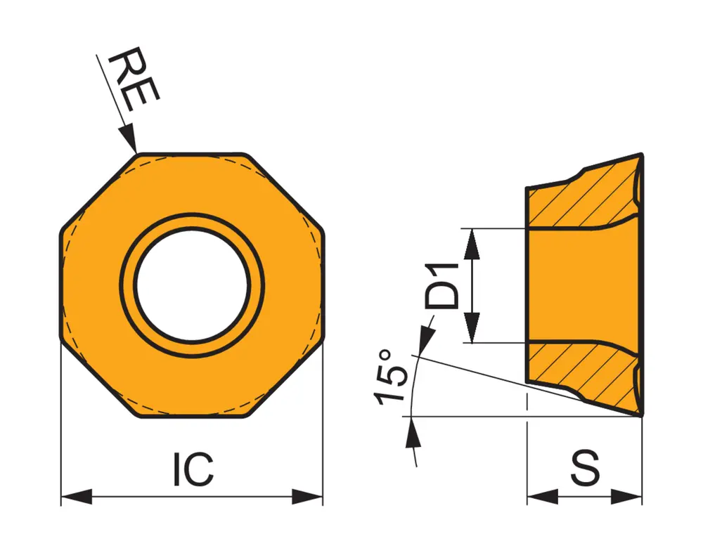 Односторонняя фрезерная пластина ODMT 0505 со стружколомами, восьмиугольная для максимальной глубины резания 3,0 мм, с радиусом при вершине 0,8 мм, точностью индексации в соответствии с классом допуска ISO-M и геометрией FM со скругленными режущими кромками и фаской, карбид WC-Co с покрытием MT-CVD M9340 в диапазонах ISO P35 -P50 и M30 -M40 для обработки стали и нержавеющей стали фрезами с копировальным торцом SOD05