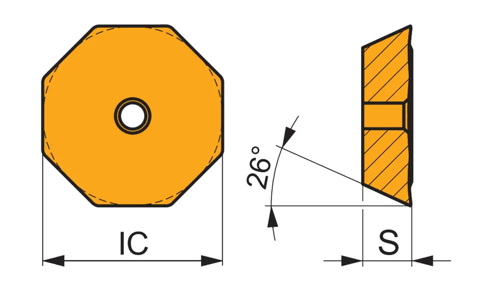 Односторонняя фрезерная пластина OFKR 0704 со стружколомами, восьмигранная для максимальной глубины резания 12,0 мм, с точностью индексации в соответствии с классом допуска ISO-K и геометрией M, мелкозернистый карбид WC-Co с покрытием PVD M8330 в диапазонах ISO P20 -P40 и M20 -M35 для обработки стали и нержавеющей стали.