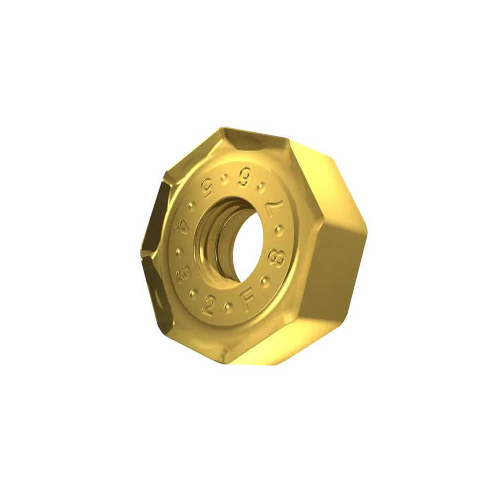 Двухсторонняя фрезерная пластина ONMX 0605, восьмиугольная для максимальной глубины резания 4 мм, с радиусом угла 0,8 мм, точностью индексации в соответствии с классом допуска ISO-M и геометрией F со скругленными режущими кромками и фаской, мелкозернистый карбид WC-Co с покрытием PVD M8340 в диапазонах ISO P25 -P50/M20 -M40 и S20 -S30 для обработки стали, нержавеющей стали и суперсплава торцевыми фрезами SON06C