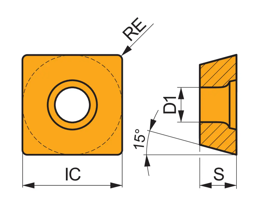 Односторонняя фрезерная пластина SDEW 0903 с плоской передней поверхностью, квадратная для максимальной глубины резания 4,5 мм, с радиусом угла 0,8 мм, точностью индексации в соответствии с классом допуска ISO-E со скругленными режущими кромками, мелкозернистый карбид WC-Co с покрытием PVD M8340 для обработки фасковыми фрезами SSD09