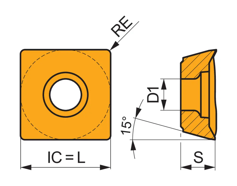 Односторонняя фрезерная пластина SDMT 1205 со стружколомами, квадратная для максимальной глубины резания 10,0 мм, с радиусом угла 0,8 мм, точностью индексации в соответствии с классом допуска ISO-M и геометрией R со скругленными режущими кромками и двойной гранью, мелкозернистый карбид WC-Co с покрытием PVD M8340 в диапазоне ISO P25 - P50 для обработки стали фрезами с уступом SSD12