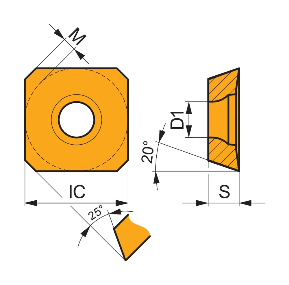Односторонняя фрезерная пластина SEET 12T3 со стружколомами, квадратная для максимальной глубины резания 6,5 мм, с точностью индексации в соответствии с классом допуска ISO-E и геометрией PM со скругленными режущими кромками и двухгранной фаской, карбид WC-Co с покрытием M9325 MT-CVD в диапазонах ISO P10 -P30 и K10 -K30 для обработки стали и чугуна