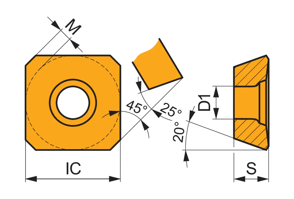 Односторонняя фрезерная пластина SEMT 09T3 со стружколомами, квадратная для максимальной глубины резания 4,5 мм, с точностью индексации в соответствии с классом допуска ISO-M со скругленными режущими кромками и фаской, карбид WC-Co с покрытием MT-CVD M9325 в диапазонах ISO P10 -P30 и K10 -K30 для обработки стали и чугуна торцевыми фрезами SSE09
