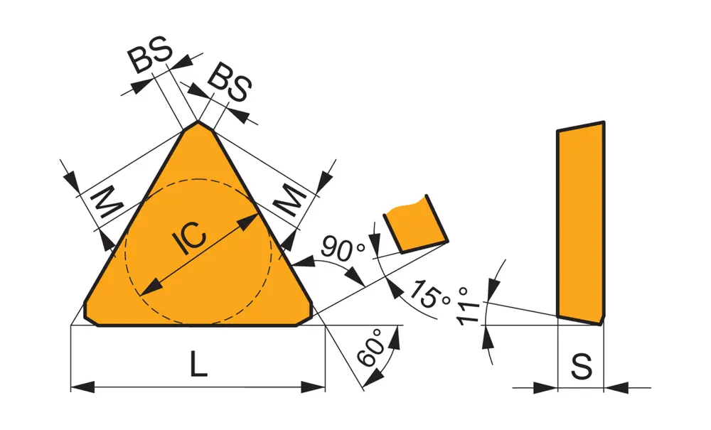Односторонняя фрезерная пластина TPCN 1603 с плоской передней поверхностью, треугольной формы для максимальной глубины резания 12 мм, с точностью индексации в соответствии с классом допуска C по ISO, с закругленными режущими кромками и фаской, мелкозернистый карбид WC-Co с покрытием PVD M8330 в диапазонах ISO P20 -P40 и K20 -K40 для обработки стали и чугуна.