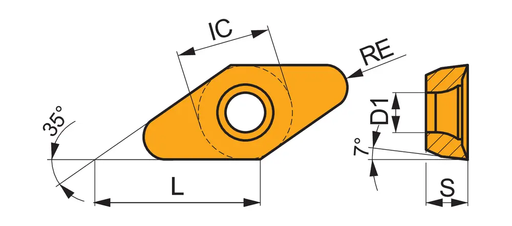 Односторонняя фрезерная пластина VCGT 2205 со стружколомами, ромбовидная 35° для максимальной глубины резания 16,0 мм, с радиусом при вершине 3,0 мм, точностью индексации в соответствии с классом допуска ISO-G и геометрией FA с острыми режущими кромками, мелкозернистый карбид WC-Co HF7 без покрытия в диапазоне прочности ISO N10 - N25 для обработки цветных металлов концевыми фрезами SVC22C