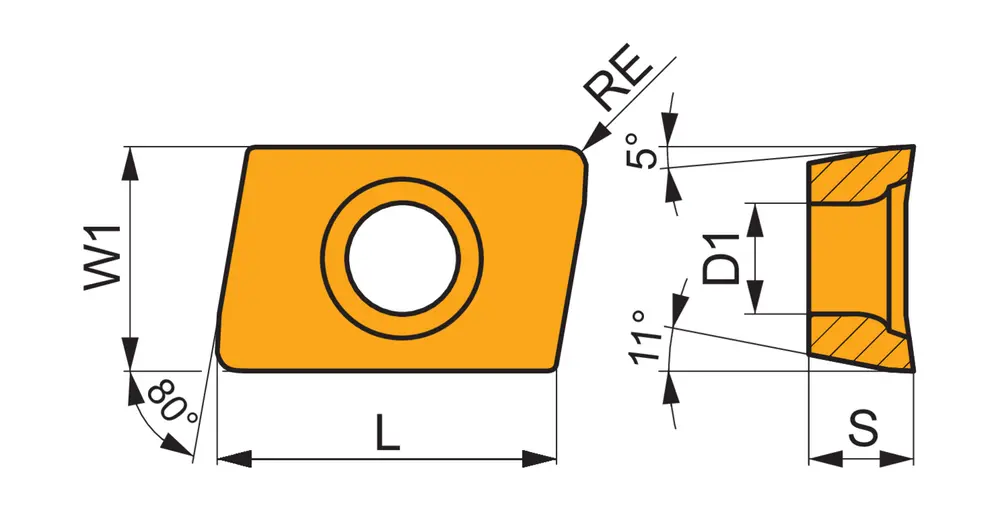 Односторонняя фрезерная пластина XPHT 1604 со стружколомами, ромбовидная 80° для максимальной глубины резания 15,0 мм, с радиусом угла 1,2 мм, точность индексации в соответствии с классом допуска ISO-H со скругленными режущими кромками и фаской, карбид WC-Co с покрытием M9325 MT-CVD в диапазоне ISO P10 -P30 для обработки стали