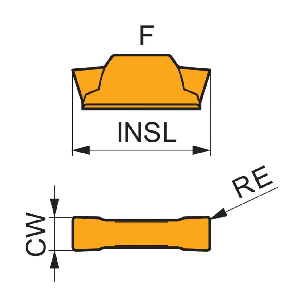 Двухсторонняя отрезная и канавочная пластина длиной 16,4 мм с шириной режущей кромки 5 мм и радиусом закругления углов 0,8 мм, точность по классу допуска M и стружколом F, класс прочности T9325, функционально градуированный карбид WC-Co с покрытием MT-CVD в диапазонах прочности ISO P15-P35 и K15-K35 для обработки стали и чугуна в сочетании с инструментами для отрезки и канавки DORMER PRAMET GF..(RL) 05 и XLCCN 0516
