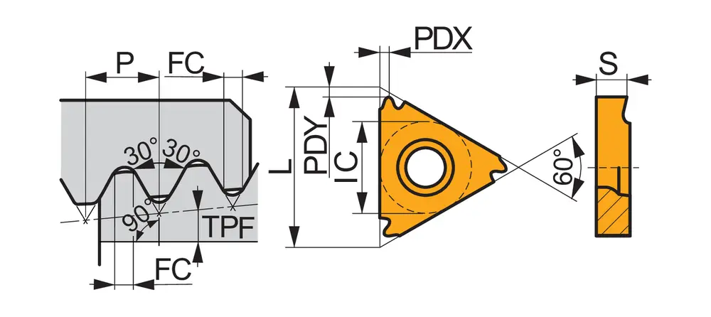 Односторонняя резьбонарезная пластина, треугольная с диаметром вписанной окружности 9,525 мм, для правостороннего нарезания наружной резьбы API с мелкозернистым карбидным сплавом WC-Co с покрытием PVD 8TPI T8030 в диапазонах ISO P25-P40/M20-M35 и K20-K40 для обработки стали, нержавеющей стали и чугуна.