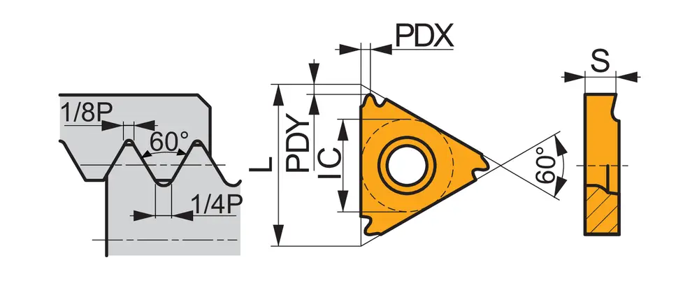 Прессованная односторонняя резьбонарезная пластина, треугольная с диаметром вписанной окружности 9,525 мм, для правостороннего нарезания наружной резьбы UN с мелкозернистым карбидом WC-Co с покрытием PVD 14TPI T8030 в диапазонах ISO P25-P40/M20-M35 и K20-K40 для обработки стали, нержавеющей стали и чугуна.