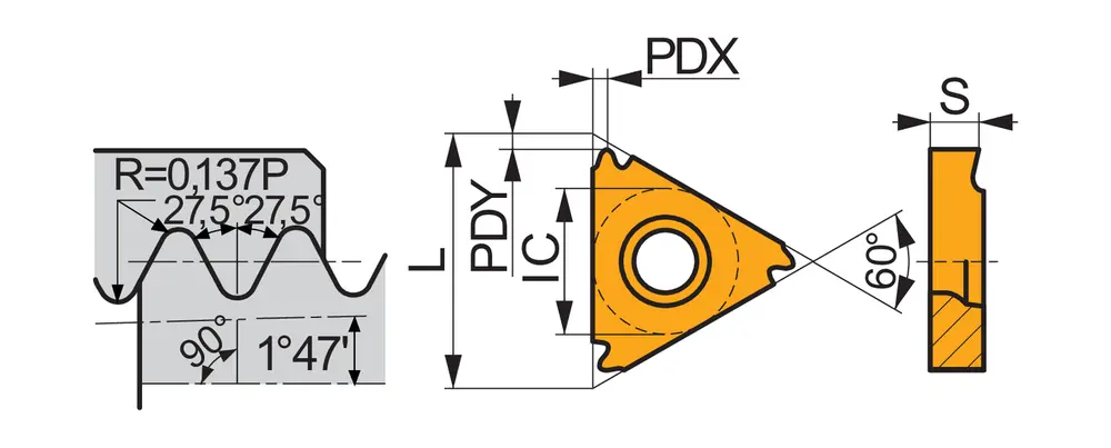 Односторонняя резьбонарезная пластина, треугольная с диаметром вписанной окружности 9,525 мм, для правостороннего нарезания наружной резьбы BSPT с мелкозернистым карбидным сплавом WC-Co с покрытием PVD 19TPI T8030 в диапазонах ISO P25-P40/M20-M35 и K20-K40 для обработки стали, нержавеющей стали и чугуна.