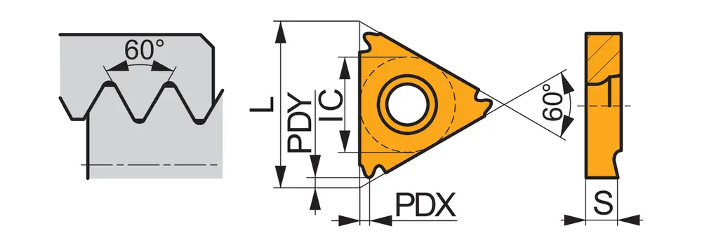 Односторонняя резьбонарезная пластина, треугольная с диаметром вписанной окружности 9,525 мм, для правостороннего частичного профиля внутренней метрической и UN резьбы ISO с шагом от 0,5 до 3 мм и числом витков на дюйм от 48 до 8, из сверхмелкозернистого твердого сплава WC-Co с покрытием PVD T8010 в диапазонах ISO P05-P15/M01-M15 и K05-K15 для обработки стали, нержавеющей стали и чугуна.