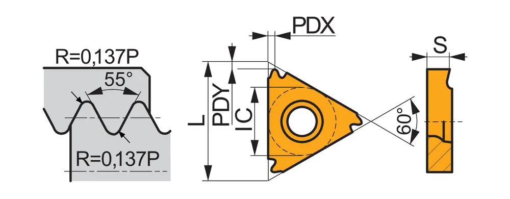 Односторонняя резьбонарезная пластина, треугольная с диаметром вписанной окружности 12,7 мм, для правостороннего нарезания наружной резьбы BSW с мелкозернистым карбидом WC-Co с покрытием PVD 7TPI T8030 в диапазонах ISO P25-P40/M20-M35 и K20-K40 для обработки стали, нержавеющей стали и чугуна.