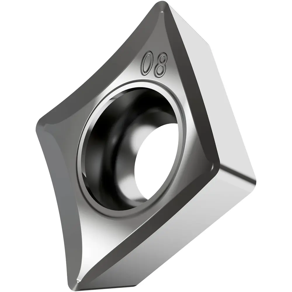 Односторонняя позитивная токарная пластина, ромбовидная 80° с зазором 7°, диаметр вписанной окружности 6,35 мм, толщина 2,38 мм, радиус вершины 0,4 мм, точность индексации в соответствии с классом допуска ISO-G, стружколом SF3 со скругленными режущими кромками, из сплава H07, непокрытый карбид WC-Co в диапазонах ISO N10 -N30 и S01 -S20, для чистовой и средней обработки цветных металлов и суперсплавов.