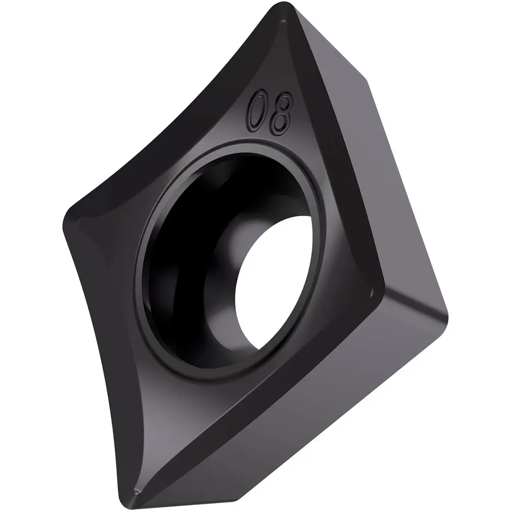 Односторонняя позитивная токарная пластина, ромб 80° с зазором 7°, диаметр вписанной окружности 9,525 мм, толщина 3,97 мм, радиус вершины 0,2 мм, точность индексации в соответствии с классом допуска ISO-G, стружколом SF3 со скругленными режущими кромками, из сплава T6310, сверхмелкозернистый карбид WC-Co с покрытием PVD в диапазонах ISO M01 -M15/N05 -N20 и S01 -S15, для чистовой и средней обработки нержавеющих сталей, цветных металлов и суперсплавов.