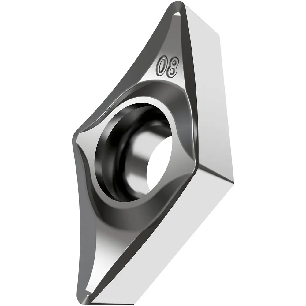 Односторонняя позитивная токарная пластина, ромбовидная 55° с зазором 7°, диаметр вписанной окружности 6,35 мм, толщина 2,38 мм, радиус вершины 0,4 мм, точность индексации в соответствии с классом допуска ISO-G, стружколом SF3 со скругленными режущими кромками, из сплава H07, непокрытый карбид WC-Co в диапазонах ISO N10 -N30 и S01 -S20, для чистовой и средней обработки цветных металлов и суперсплавов.