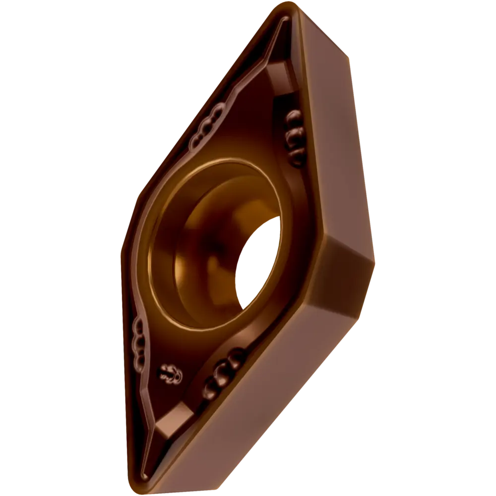 Односторонняя позитивная токарная пластина, ромбовидная 55° с зазором 7°, диаметр вписанной окружности 9,525 мм, толщина 3,97 мм, радиус вершины 0,4 мм, точность индексации в соответствии с классом допуска ISO-M, стружколом FM со скругленными режущими кромками, из сплава T8430, мелкозернистого твердого сплава WC-Co с покрытием PVD в диапазонах ISO P20 -P40 и M20 -M35, для чистовой и средней обработки сталей и нержавеющих сталей.