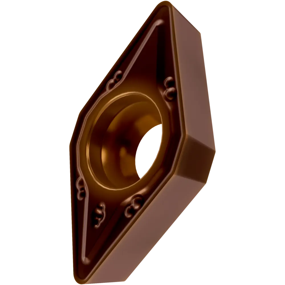 Односторонняя позитивная токарная пластина, ромбовидная 55° с зазором 7°, диаметр вписанной окружности 9,525 мм, толщина 3,97 мм, радиус вершины 1,2 мм, точность индексации в соответствии с классом допуска ISO-M, стружколом RM со скругленными режущими кромками, из сплава T8430, мелкозернистого твердого сплава WC-Co с покрытием PVD в диапазонах ISO P20 -P40 и M20 -M35, для чистовой и тяжелой обработки сталей и нержавеющих сталей.