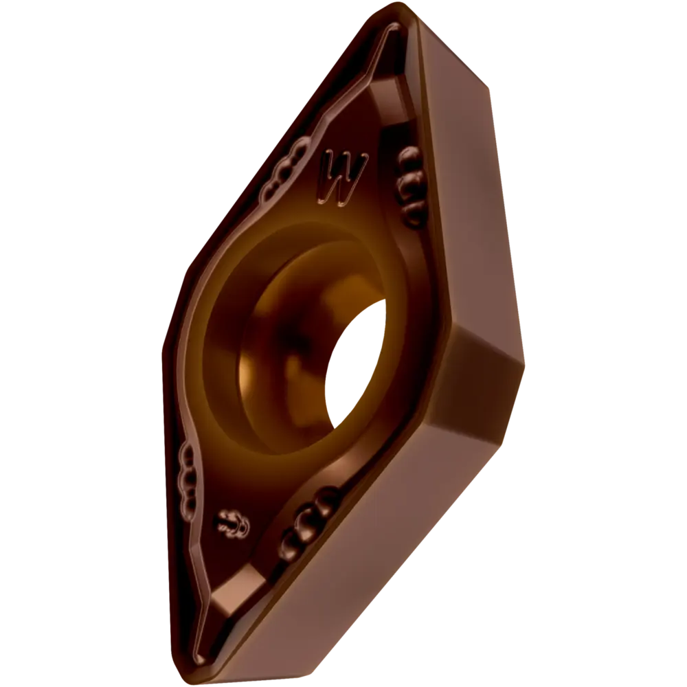 Специальная конструкция позитивной токарной пластины, ромбовидная 55° с зазором 7°, диаметр вписанной окружности 9,525 мм, толщина 3,97 мм, радиус вершины 0,4 мм, точность индексации в соответствии с классом допуска ISO-M, стружколом FM с конструкцией кромки WIPER, из сплава T8430, мелкозернистого твердого сплава WC-Co с покрытием PVD в диапазонах ISO P20 -P40 и M20 -M35, для чистовой и средней обработки сталей и нержавеющих сталей.
