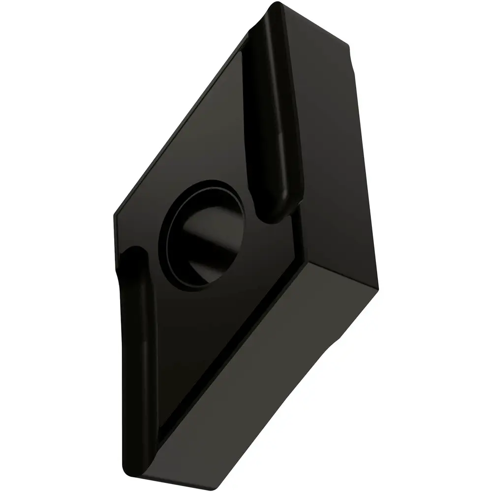 Двусторонняя негативная токарная пластина, ромбовидная 55° с диаметром вписанной окружности 12,7 мм, толщиной 6,35 мм, радиусом при вершине 0,4 мм, точностью индексации в соответствии с классом допуска ISO M, стружколомом SI со скругленными режущими кромками, из сплава T7325, функционально-градуированного твердого сплава WC-Co с покрытием MT-CVD в диапазоне ISO M10 - M25, для средней и тяжелой обработки нержавеющих сталей левосторонним токарным резцом.