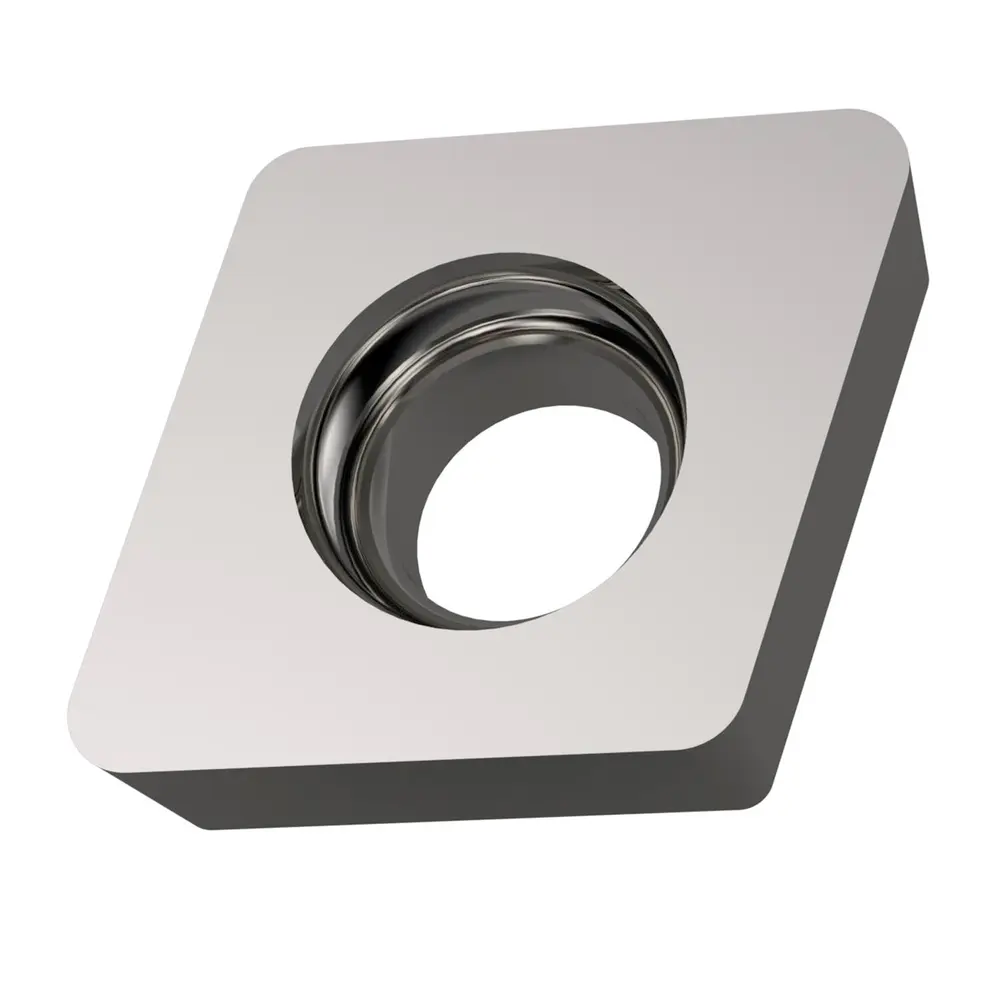 Односторонняя позитивная токарная пластина, ромбовидная 75° с зазором 7°, диаметром вписанной окружности 7,94 мм, толщиной 3,18 мм, радиусом при вершине 0,4 мм и точностью индексации в соответствии с классом допуска ISO-M, из сплава H07, непокрытого карбида WC-Co в диапазоне ISO K10 -K25, для чистовой и получистовой обработки чугуна.