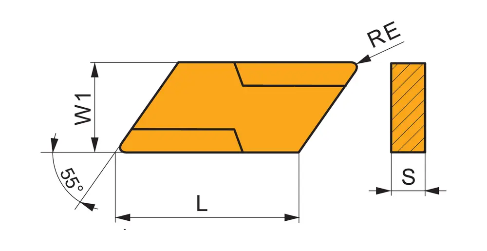 Специальная негативная токарная пластина, параллелограмм 55° с длиной главной кромки 16 мм, толщиной 4,76 мм, радиусом при вершине 0,5 мм и точностью индексации в соответствии с классом допуска ISO-U, стружколомом 32, из сплава T9325, функционально-градуированного твердого сплава WC-Co с покрытием MT-CVD в диапазоне ISO P15 -P35, для средней и тяжелой обработки сталей левосторонним токарным резцом.