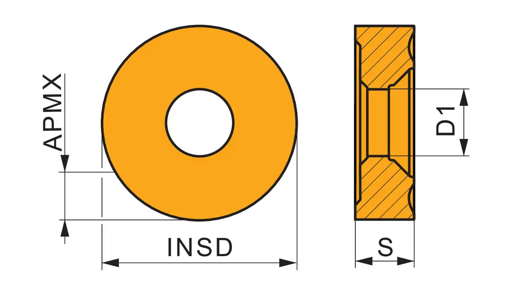 Односторонняя негативная пластина для зачистки прутка, круглая, диаметром 38,1 мм, толщиной 12,7 мм для глубины резания 8 мм, точность индексации в соответствии с классом допуска ISO-G, стружколом MM, из сплава T7325, функционально-градуированный карбид WC-Co с покрытием MT-CVD в диапазоне ISO M10 - M25, для нержавеющих сталей.
