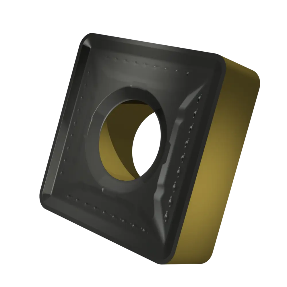 Двусторонняя негативная токарная пластина, квадратная с диаметром вписанной окружности 19,05 мм, толщиной 6,35 мм, радиусом при вершине 1,6 мм и точностью индексации в соответствии с классом допуска ISO-M, стружколомом HR2, из сплава T9415, функционально-градуированного твердого сплава WC-Co с покрытием MT-CVD в диапазоне ISO P05 -P30, для тяжелой и сверхтяжелой обработки сталей.