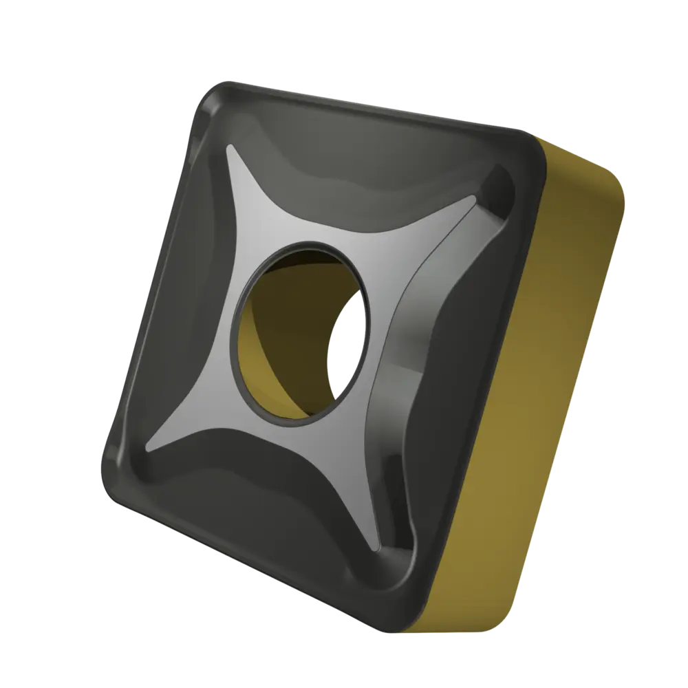 Двусторонняя негативная токарная пластина, квадратная с диаметром вписанной окружности 25,4 мм, толщиной 7,94 мм, радиусом при вершине 2,4 мм и точностью индексации в соответствии с классом допуска ISO M, стружколом NRM, из сплава T9415, функционально-градуированного твердого сплава WC-Co с покрытием MT-CVD в диапазоне ISO P05 -P30, для средней и тяжелой обработки сталей.