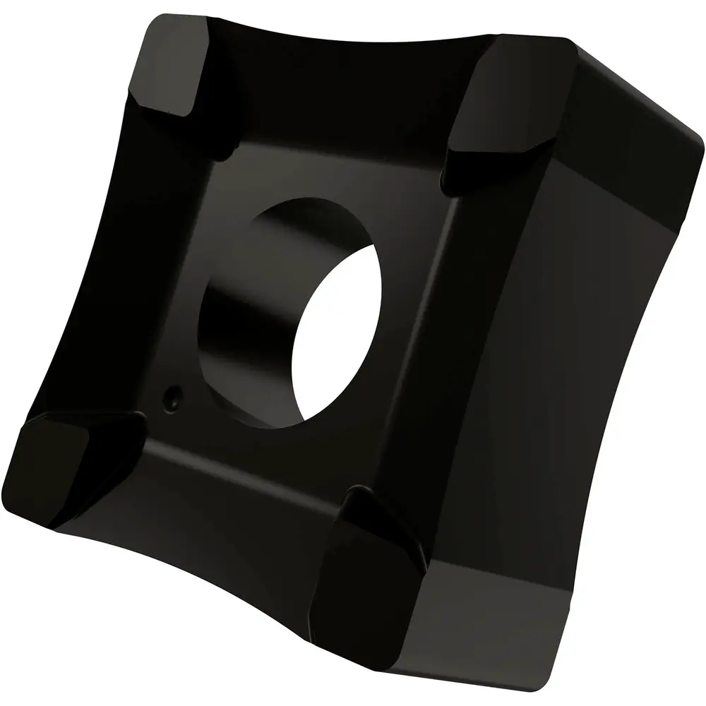 Двусторонняя пластина для снятия заусенцев, квадратная, с длиной основной режущей кромки 19,05 мм, толщиной 8,15 мм и рабочим радиусом 45 мм для труб диаметром от 52 до 65 мм, функционально-градуированный карбид WC-Co с покрытием T9335 MT-CVD в диапазонах ISO P20-P45/M15-M40 и S15-S25 для снятия заусенцев с наружной поверхности труб и труб из стали, нержавеющей стали и суперсплавов.