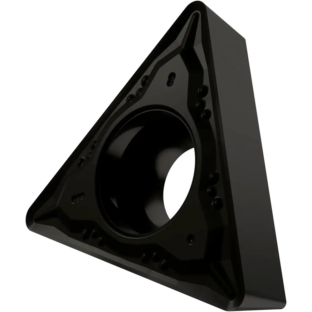 Односторонняя позитивная токарная пластина, треугольная с зазором 7°, диаметр вписанной окружности 9,525 мм, толщина 3,97 мм, радиус вершины 0,8 мм, точность индексации в соответствии с классом допуска ISO-M, стружколом FM со скругленными режущими кромками, из сплава T9325, функционально-градуированного твердого сплава WC-Co с покрытием MT-CVD в диапазонах ISO P15 -P35 и M10 -M30, для чистовой и получистовой обработки сталей и нержавеющих сталей.