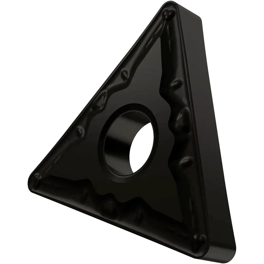 Двусторонняя негативная токарная пластина, треугольная с диаметром вписанной окружности 9,525 мм, толщиной 4,76 мм, радиусом при вершине 0,8 мм, точностью индексации в соответствии с классом допуска ISO M, стружколомом FM со скругленными режущими кромками, из сплава T7325, функционально-градуированного твердого сплава WC-Co с покрытием MT-CVD, для чистовой и средней обработки