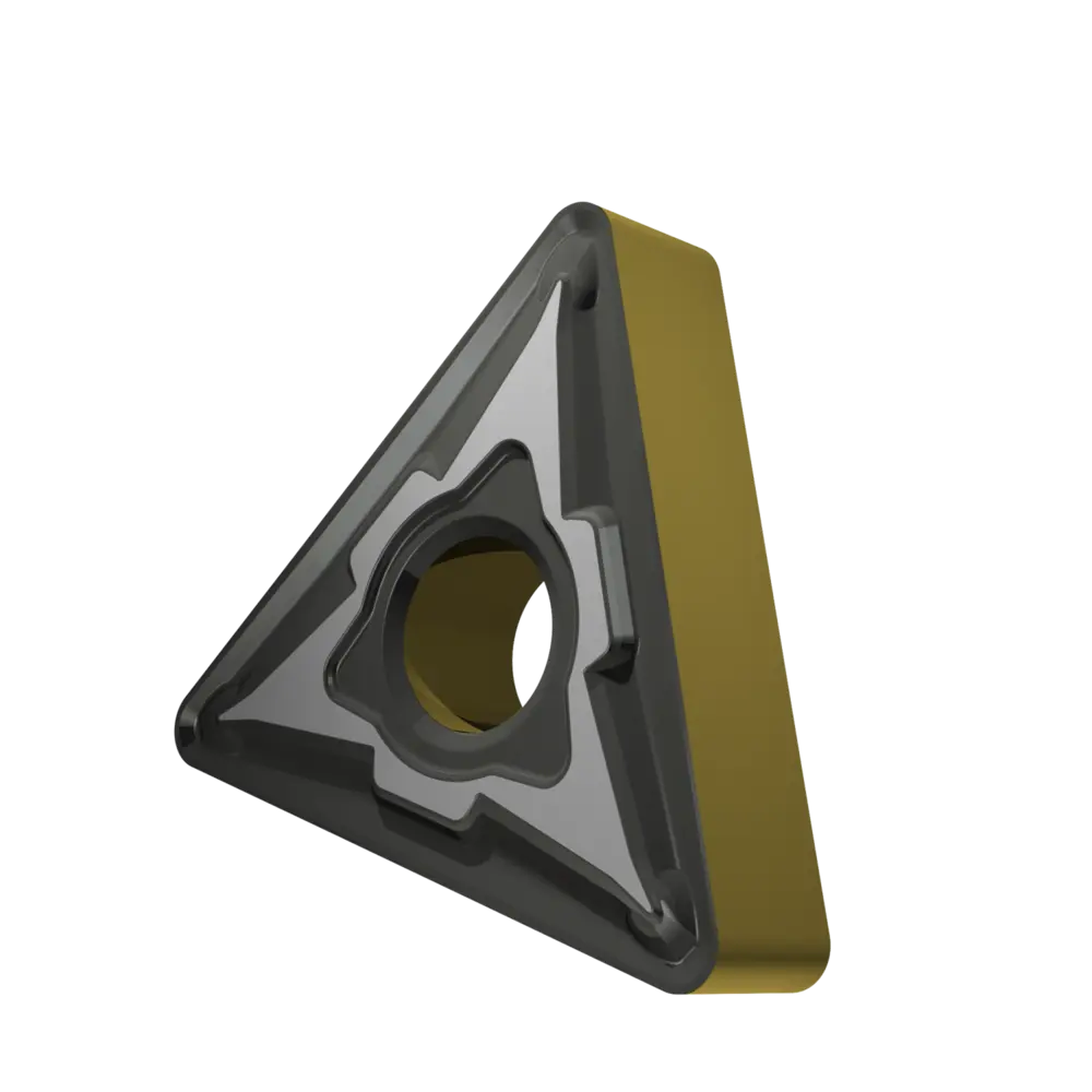 Двусторонняя негативная токарная пластина, треугольная с диаметром вписанной окружности 9,525 мм, толщиной 4,76 мм, радиусом при вершине 1,2 мм, точностью индексации в соответствии с классом допуска ISO M, стружколомом M со скругленными режущими кромками, из сплава T9415, функционально-градуированного твердого сплава WC-Co с покрытием MT-CVD в диапазоне ISO P05 -P30, для чистовой и тяжелой обработки сталей.