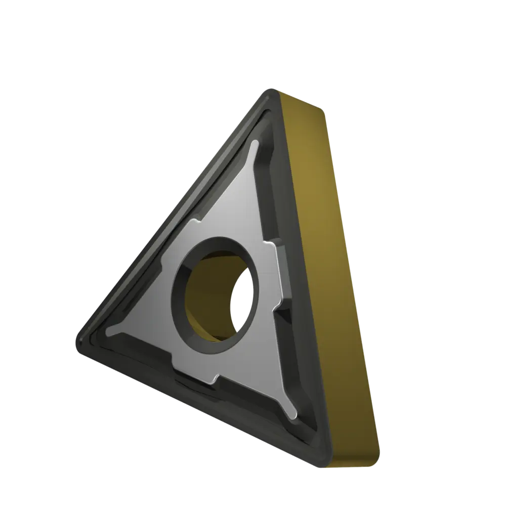 Двусторонняя негативная токарная пластина, треугольная с диаметром вписанной окружности 12,7 мм, толщиной 4,76 мм, радиусом при вершине 0,8 мм, точностью индексации в соответствии с классом допуска ISO-M, стружколомом R со скругленными режущими кромками, из сплава T9415, функционально-градуированного твердого сплава WC-Co с покрытием MT-CVD в диапазоне ISO P05 -P30, для средней и тяжелой обработки сталей.