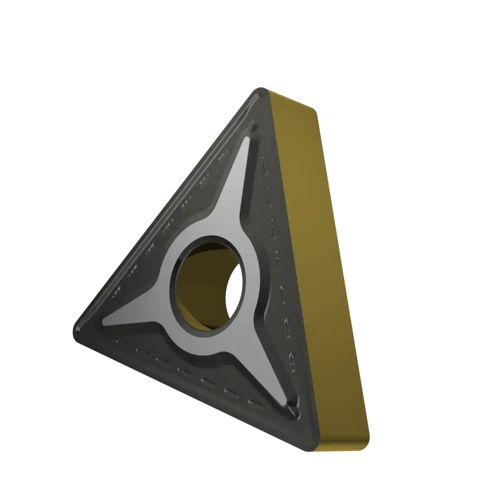 Двусторонняя негативная токарная пластина, треугольная с диаметром вписанной окружности 12,7 мм, толщиной 4,76 мм, радиусом при вершине 0,8 мм, точностью индексации в соответствии с классом допуска ISO-M, стружколомом RM со скругленными режущими кромками, из сплава T9415, функционально-градуированного твердого сплава WC-Co с покрытием MT-CVD в диапазоне ISO P05 -P30, для средней и тяжелой обработки сталей.