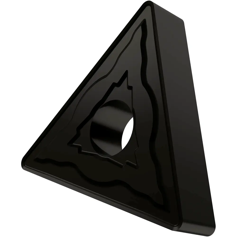 Двусторонняя негативная токарная пластина, треугольная с диаметром вписанной окружности 12,7 мм, толщиной 4,76 мм, радиусом при вершине 1,2 мм, точностью индексации в соответствии с классом допуска ISO M, стружколомом NMR со скругленными режущими кромками, из сплава T9325, функционально-градуированного твердого сплава WC-Co с покрытием MT-CVD в диапазонах ISO P15 -P35 и M10 -M30, для чистовой и тяжелой обработки сталей и нержавеющих сталей.