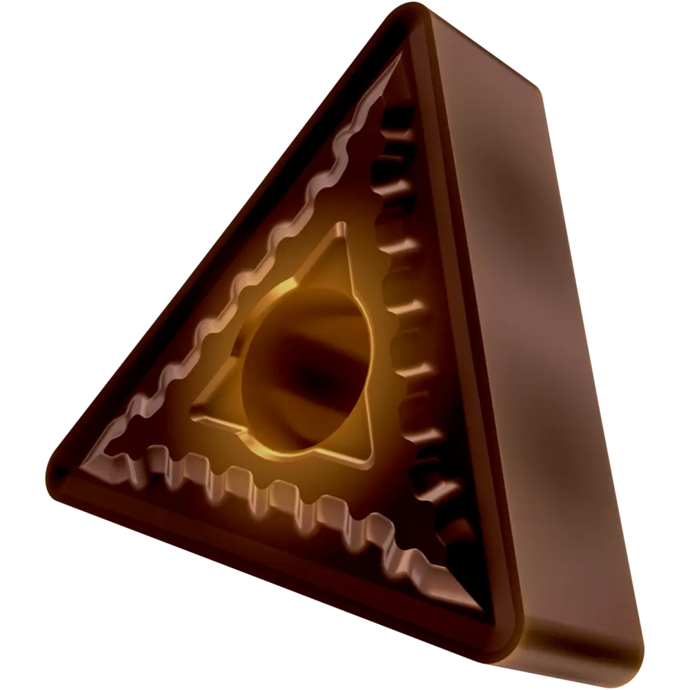 Двусторонняя негативная токарная пластина, треугольная с диаметром вписанной окружности 12,7 мм, толщиной 4,76 мм, радиусом при вершине 1,2 мм, точностью индексации в соответствии с классом допуска ISO-M, стружколомом SM со скругленными режущими кромками, из сплава T8415.