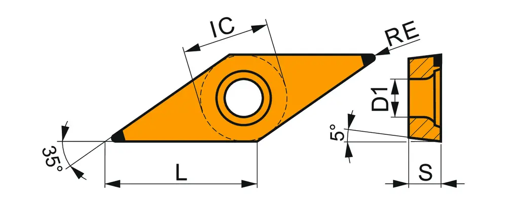 Пластина для твердого точения с 2 вершинами из CBN с одной стороны, ромбовидная форма 35° с зазором 5°, диаметр вписанной окружности 9,525 мм, толщина 4,76 мм, радиус при вершине 0,8 мм, точность индексации в соответствии с классом допуска ISO-G, закругленные режущие кромки с фаской T-образной формы -20°/0,1 мм, из сплава TB310, кубический нитрид бора без покрытия в диапазоне ISO H01 -H10, для высокоскоростной обработки закаленных материалов.