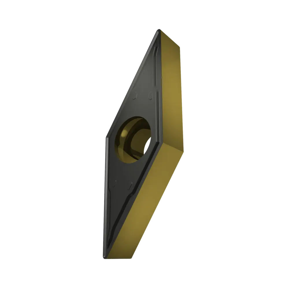 Односторонняя позитивная токарная пластина, ромбовидная 35° с зазором 5°, диаметр вписанной окружности 9,525 мм, толщина 4,76 мм, радиус вершины 0,4 мм, точность индексации в соответствии с классом допуска ISO-M, стружколом FM2 со скругленными режущими кромками, из сплава T9415, функционально-градуированного твердого сплава WC-Co с покрытием MT-CVD в диапазоне ISO P05 -P30, для чистовой и получистовой обработки сталей.
