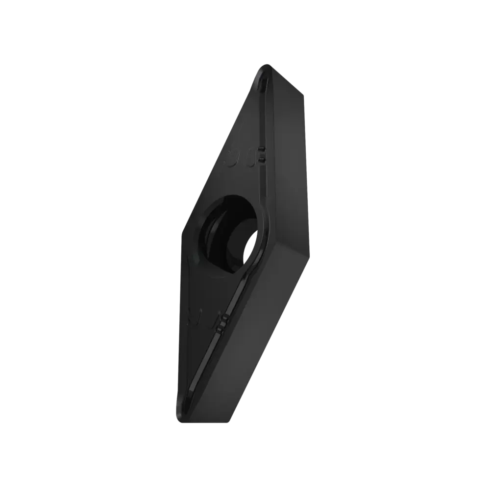 Односторонняя позитивная токарная пластина, ромбовидная 35° с зазором 5°, диаметр вписанной окружности 9,525 мм, толщина 4,76 мм, радиус вершины 0,8 мм, точность индексации в соответствии с классом допуска ISO-M, стружколом UR со скругленными режущими кромками, из сплава T9310, функционально-градуированного твердого сплава WC-Co с покрытием MT-CVD в диапазоне ISO P01 -P15, для чистовой и тяжелой обработки сталей
