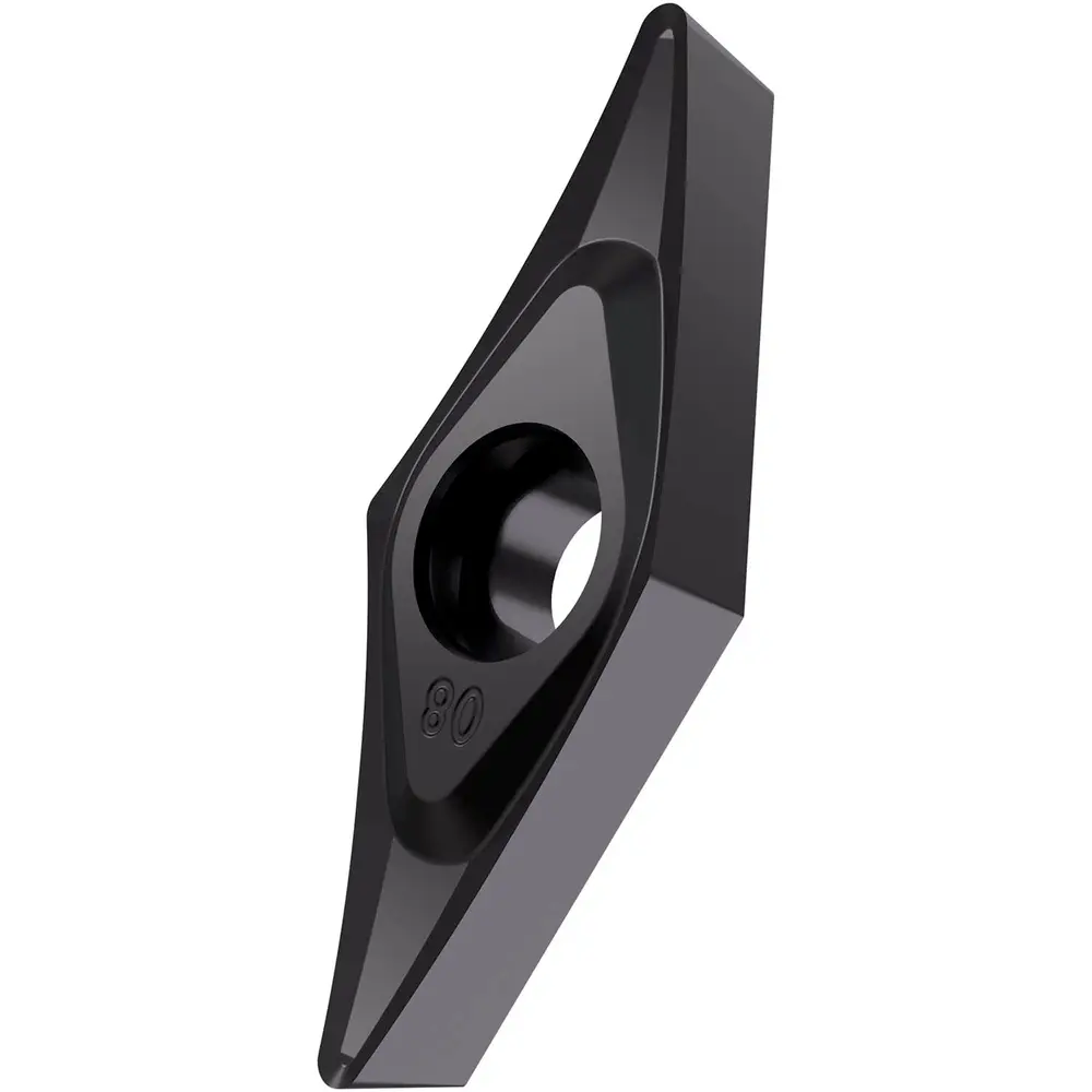 Односторонняя позитивная токарная пластина, ромбовидная 35° с зазором 7°, диаметр вписанной окружности 6,35 мм, толщина 3,18 мм, радиус вершины 0,1 мм, точность индексации в соответствии с классом допуска ISO-G, стружколом SF3 со скругленными режущими кромками, из сплава T6310, сверхмелкозернистый карбид WC-Co с покрытием PVD в диапазонах ISO M01 - M15/N05 - N20 и S01 - S15, для чистовой и средней обработки нержавеющих сталей, цветных металлов и суперсплавов.