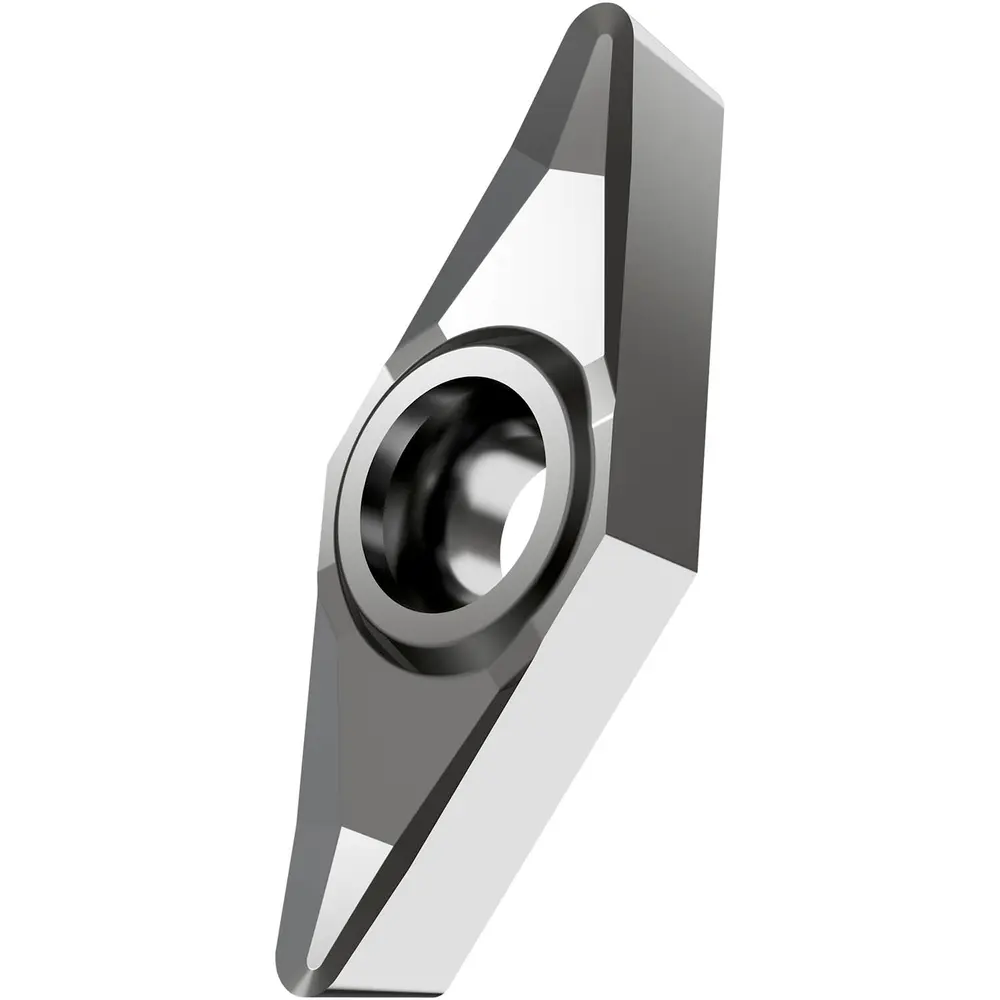 Односторонняя позитивная токарная пластина, ромбовидная 35° с зазором 7°, диаметр вписанной окружности 6,35 мм, толщина 3,18 мм, радиус вершины 0,2 мм, точность индексации в соответствии с классом допуска ISO-G, стружколом AL с острыми режущими кромками, из сорта HF7, мелкозернистый карбид WC-Co без покрытия в диапазоне ISO N10 - N25, для чистовой и тяжелой обработки цветных металлов.