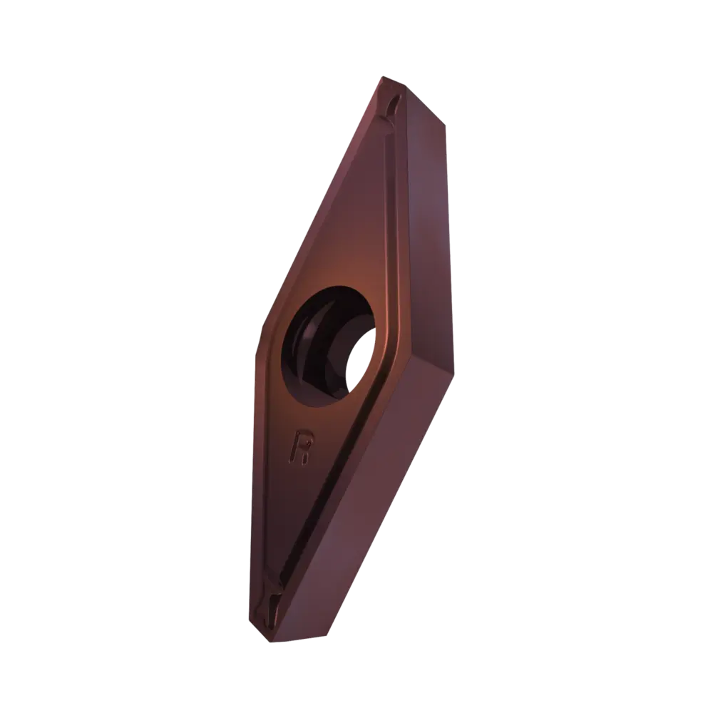 Специальная позитивная токарная пластина, ромбовидная 35° с зазором 7°, диаметр вписанной окружности 7,94 мм, толщина 3,18 мм, радиус при вершине 0,1 мм, точность индексации в соответствии с классом допуска ISO-G, стружколом FF2 с острыми режущими кромками, из сплава T8415.