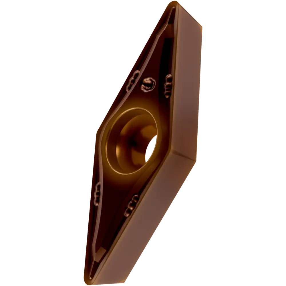 Односторонняя позитивная токарная пластина, ромбовидная 35° с зазором 7°, диаметр вписанной окружности 9,525 мм, толщина 4,76 мм, радиус вершины 0,4 мм, точность индексации в соответствии с классом допуска ISO-M, стружколом FM со скругленными режущими кромками, из сплава T8430, мелкозернистого твердого сплава WC-Co с покрытием PVD в диапазонах ISO P20 -P40 и M20 -M35, для чистовой и средней обработки сталей и нержавеющих сталей.