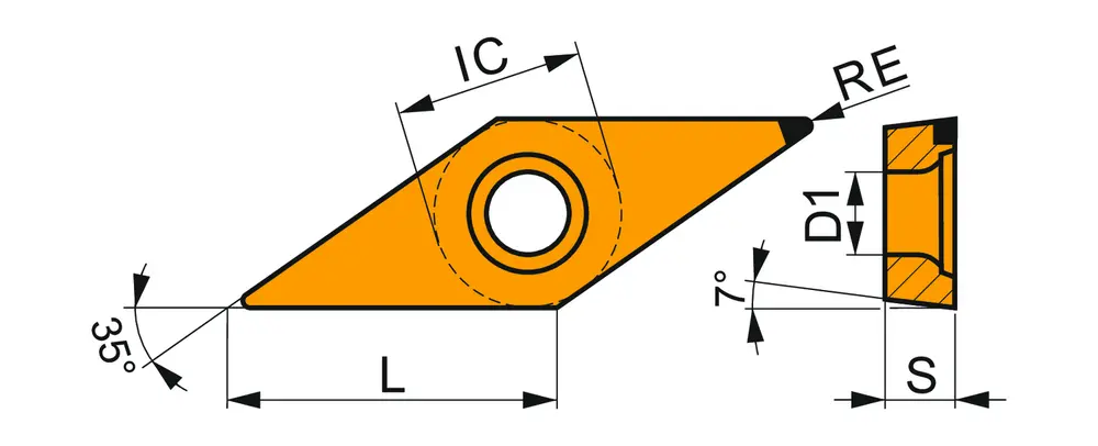 Токарная пластина с вершиной из PCD, ромбовидная 35° с зазором 7° и диаметром вписанной окружности 9,525 мм, толщиной 4,76 мм, радиусом при вершине 0,8 мм, точностью индексации в соответствии с классом допуска ISO-M, острыми режущими кромками, марки PD1, непокрытый поликристаллический алмаз в диапазоне ISO N05 -N25, для высокоскоростной обработки цветных металлов.