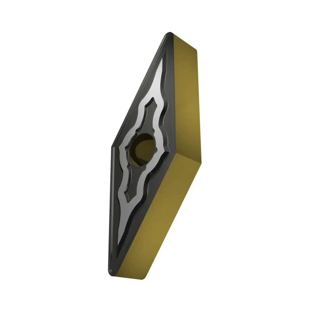 Двусторонняя негативная токарная пластина, ромбовидная 35° с диаметром вписанной окружности 9,525 мм, толщиной 4,76 мм, радиусом при вершине 0,8 мм, точностью индексации в соответствии с классом допуска ISO-M, стружколомом NMR со скругленными режущими кромками, из сплава T9415, функционально-градуированного твердого сплава WC-Co с покрытием MT-CVD в диапазоне ISO P05 -P30, для чистовой и тяжелой обработки сталей.